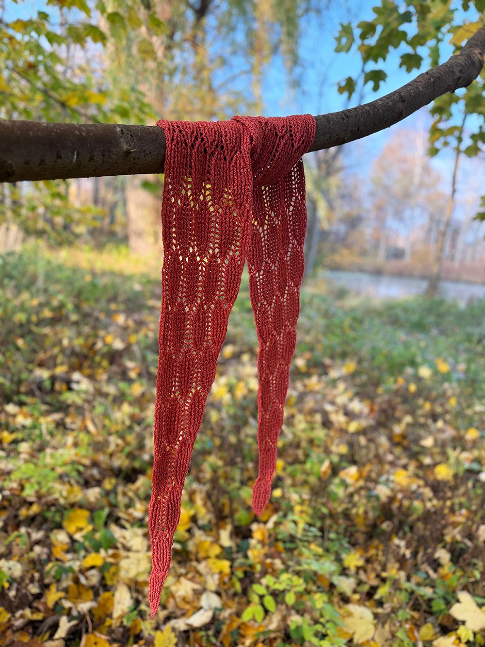 A scarf made from tip to tip in a reversible leaf pattern. This means that you can make it in many different sizes. In the pattern I have described 2 different sizes and given instructions on how to make it even larger.